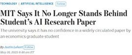 Multiple sources (see here, here and here to cite a few) reported that things started going south in January 2025, when an unnamed computer scientist with experience in materials science approached MIT professors with questions about the AI tool used in the lab and its actual impact on the reported innovations. Unable to provide answers to the queries, MIT released this statement in which they noted that they “conducted an internal, confidential review and concluded that the paper should be withdrawn from public discourse.” The release also included a statement from the professors who initially backed the paper, which said the following: